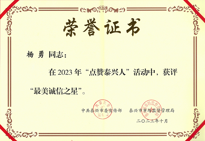 誠信是做人之本、立業之基,是社會有序運行、健康發展的重要基石。日前,泰興市委宣傳部、泰興市場監管局聯合開展2023年“點贊泰興人”活動。我單位董事長楊勇榮獲”最美誠信之星“榮譽稱號。